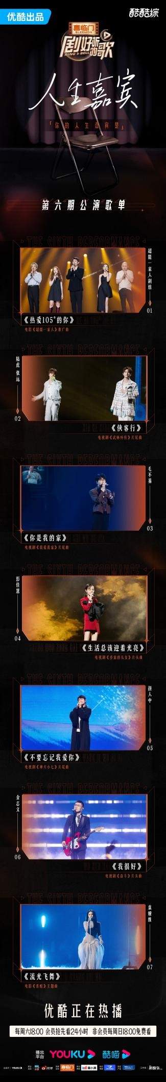 由优酷出品,七维动力承制,喜临门冠名的中国首档全明星影视原声(OST)音乐节目《剧好听的歌》每周六18:00在优酷独家更新。节目邀请古巨基、毛不易、胡夏、陆虎张远、金志文、袁娅维、单依纯、颜人中、彭佳慧、苏运莹、米卡、张含韵等多位歌手,共同打造一场感动的听觉盛宴。在上周品味过爱情的甜蜜与缱绻之后,本周《剧好听的歌》将以“人生嘉宾”为题,用歌声描绘前行道路上不可或缺的珍贵存在。