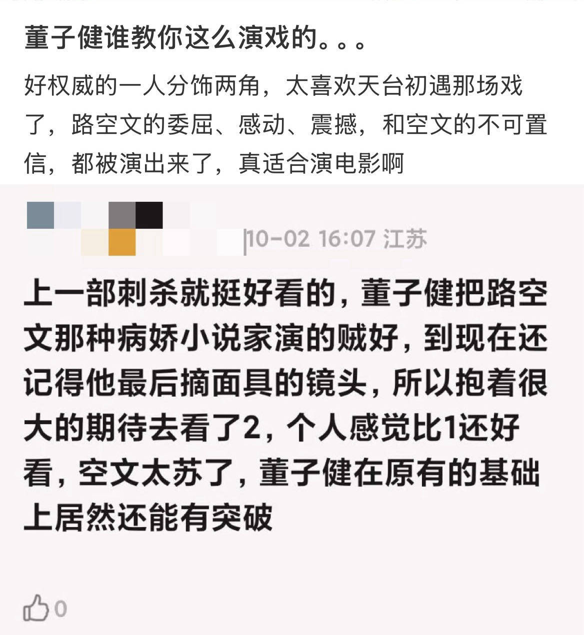 演员上来说,我真的好爱董子健,你怎么这么会演啊,真的完美的符合我想象中路空文和空文的样子。里空文出场的时候,我只有心疼,我那经历了网暴被抢走梦想的小说家,千万不要被打败。空文出场我内心直接哇偶,我那清爽干净不油腻的侠义少年,如第一部一样,还是正气十足!