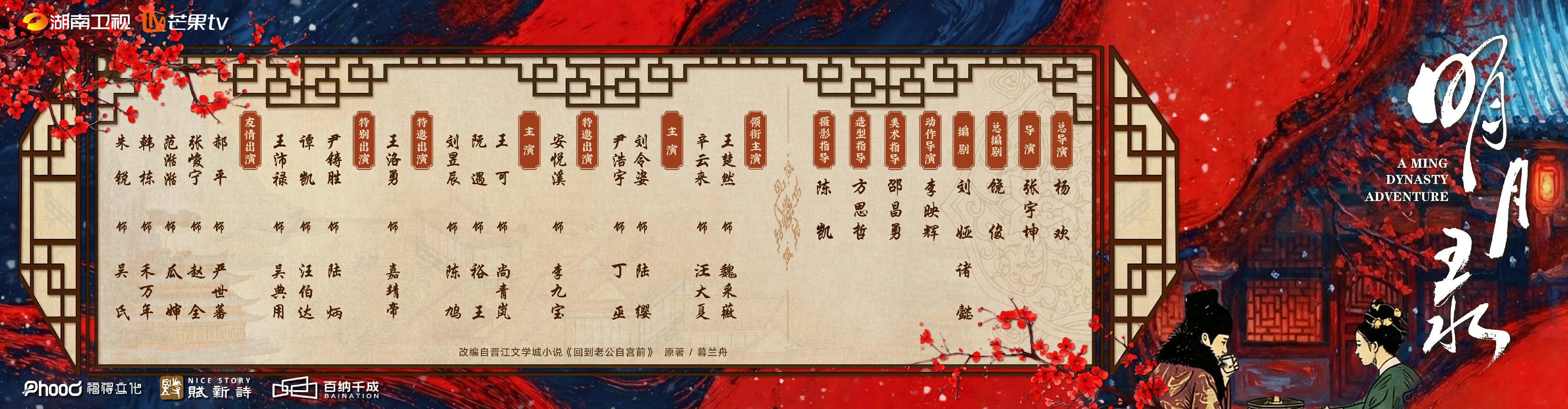 由上海福得文化创意有限公司、上海赋新诗影视文化有限公司、北京百纳千成影视股份有限公司出品,杨欢任总导演,张宇坤导演,饶俊任总编剧,刘娅、诸懿编剧,李映辉任动作导演,邵昌勇任美术指导,方思哲任造型指导,陈凯任摄影指导,王楚然、辛云来领衔主演,刘令姿、尹浩宇主演,安悦溪特邀出演,王可、阮遇、刘昱辰主演,王洛勇特邀出演,尹铸胜、谭凯、王沛禄特别出演,郝平、张峻宁、范湉湉、韩栋、朱锐友情出演的历史悬爱剧《明月录》今日官宣,将在湖南卫视、芒果TV双平台上线播出。