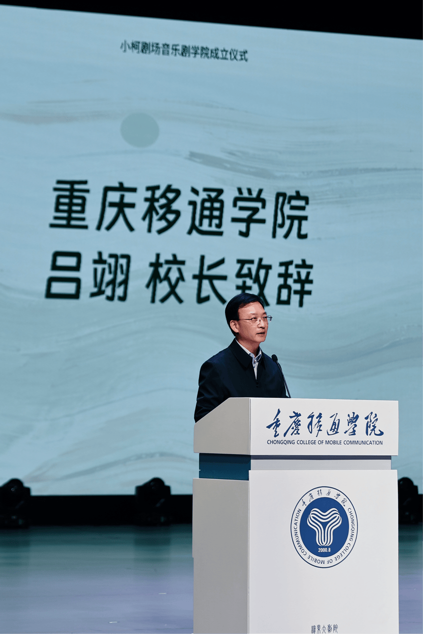 重庆移通学院校长吕翊教授在致辞中,深刻阐释了此次双强联合的核心逻辑与学院发展的核心定位。他首先回顾了学校十余年音乐剧教育的深耕成果:从零构建“课堂+剧目+舞台”三维培养体系,实现双校区协同发展,成立音乐剧产业学院,累计排演30余部原创剧目、培养2000余名专业人才,众多毕业生已在演艺行业崭露头角,为校企合作奠定了深厚的教育与实践基础。吕翊校长强调,此次与小柯剧场的合作并非简单的品牌叠加,而是实战基因的深度融合,双方在艺术教育理念、人才培养模式、深耕原创音乐剧的情怀上高度契合,这也是合作能够行稳致远的核心支撑。他明确学院将坚守“实战型音乐剧演艺学院”的定位,构建“课堂直通舞台、校园连接剧场”的育人闭环,让学生在专业教师全流程指导下,完成从校园学子到职业演员的蜕变,真正实现艺术教育与产业需求的同频共振。
